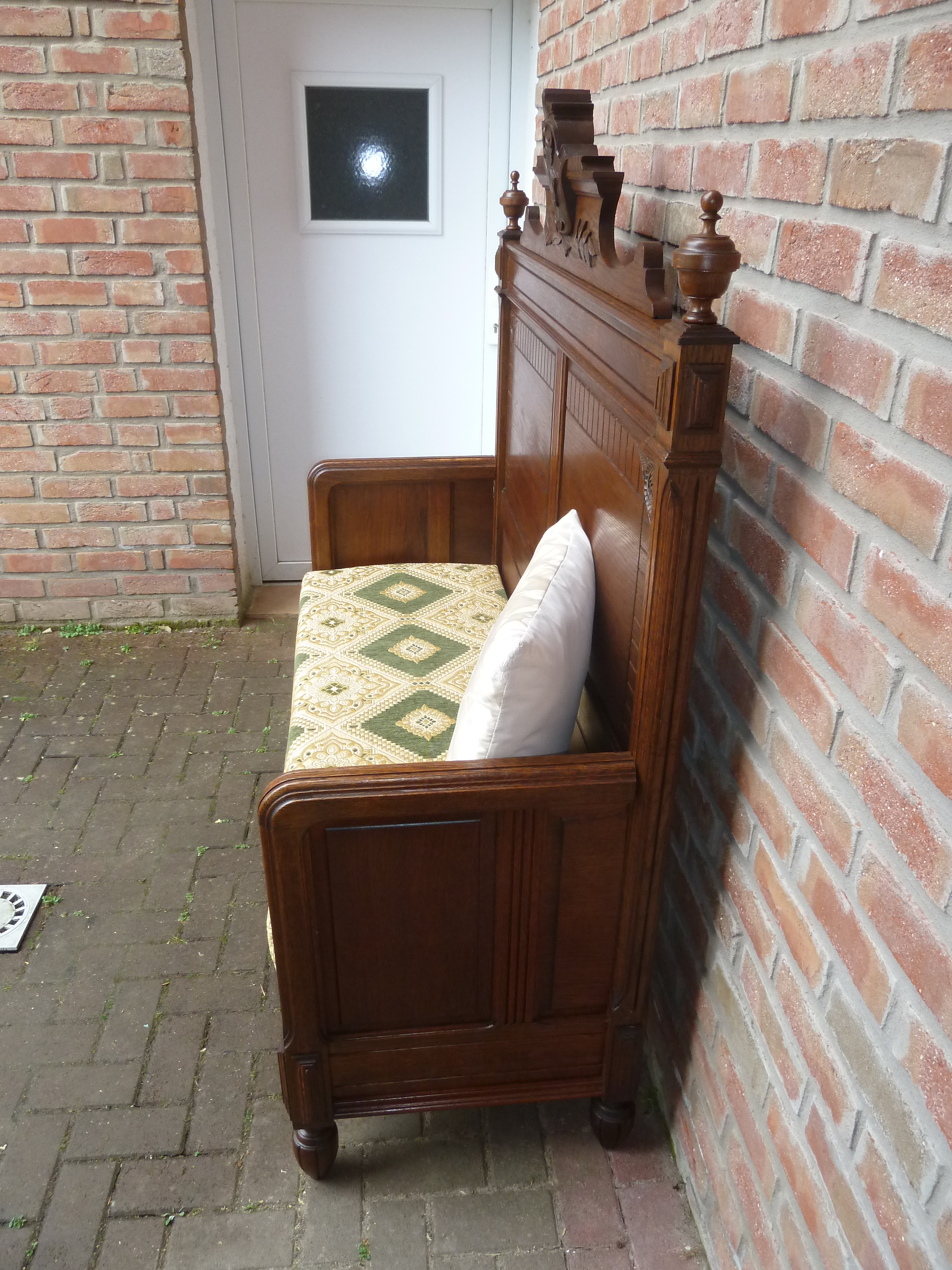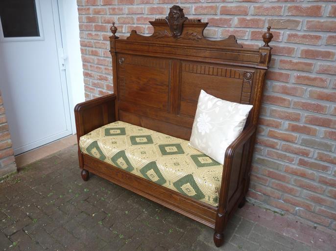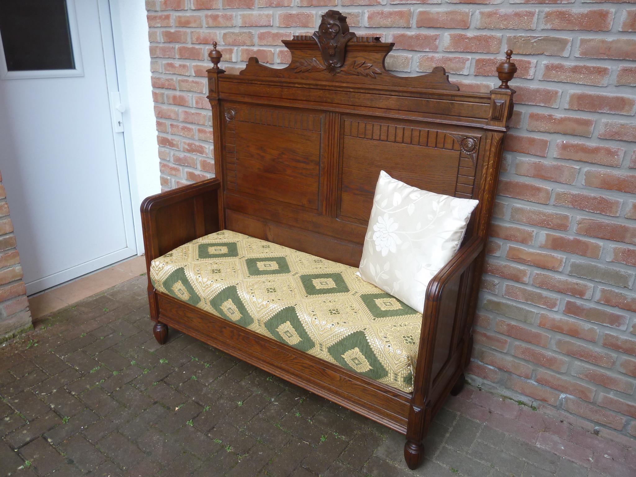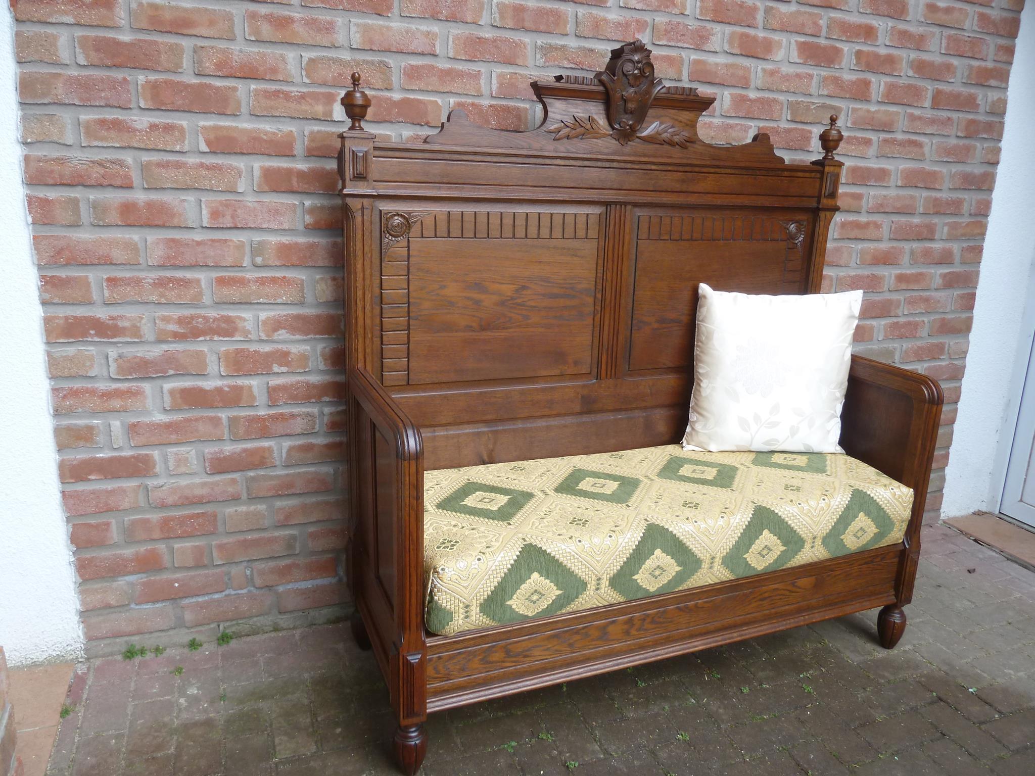 Sehr schöne alte Bank zu verkaufen. Vollholz. Bezug in Gold mit günen Einlagen
